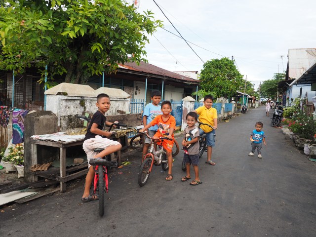 When the main rivers flood, water flows into the plantations bringing fish with it. Local Indonesians find places to fish wherever there is water, in wide, deep dug canals along the side of the roads, which help to prevent flooding across the roads, and along river banks. Children and adults are quite content with fishing rods, some sticks with fishing line and bait, to catch fish for dinner. Mothers sit on a blanket waiting patiently, who knows what they catch in these waters. I guess the Indonesians are quite resilient, you have to be, living in these conditions. Yet they are happy with the little they have. Again, smiling, waving and saying Hello. I guess innocence is bliss in a way.