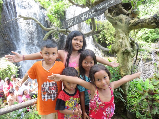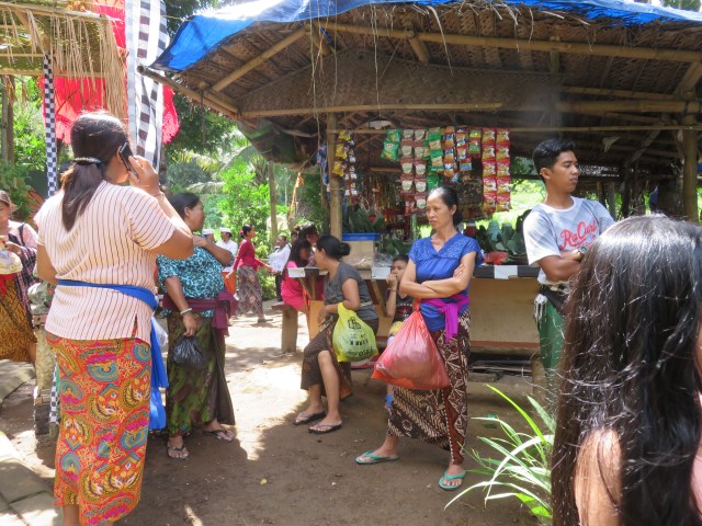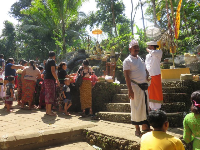 Once again, after waking to the crowing of a rooster and also to the excited chattering of youngsters, Julie, Amy, and their cousins went down to the beach for a swim, arriving back at nine for a bowl of rice and green bean stir fry breakfast. “We are going to the purification ceremony now, just beyond Ubud at the waterfalls,” Julie said. “We must wear brightly coloured sarongs, and anyone can participate in the ceremony, making offerings in bamboo woven bowls with flowers, incense, and a small amount of money inside. “