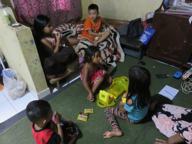 That evening at Julie’s house, dinner consisted of rice accompanied by spicy vegetables and chicken. Rice is usually consumed at each meal, typically with duck, fish, or pork. Being poor, this family might only afford a bit of chicken or fish, a few vegetables and fruit, that they obtain from local vendors on the roadsides. After dinner we brushed our teeth outside of the shower using a tap, spitting on the floor then washing the toothpaste down the drain.