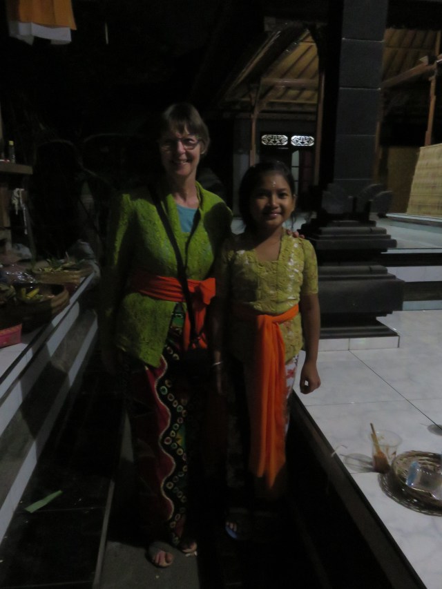 The following day we spent the morning relaxing at home, helping Amy with her English schoolwork. Wearing a sarong and long sleeve laced jacket in bright orange and an oversized scarf tied around my waist, Amy, Julie, and I headed up into the hills in the early evening to a different temple encircled by trees. A row of food stalls was set up outside the temple, with twinkling fairy lights strung between them. Starting the ceremony outside the main temple we placed our offerings on an altar with sticks of sweet-scented incense. Sitting on the ground with the people facing the priest, we prayed. Then the priest blessed us with water by sprinkling some on our heads for purification, and within the palms of our hands. We sipped the water from our palms, meaning purification of speech, then passed our hands over our head after the fourth time.